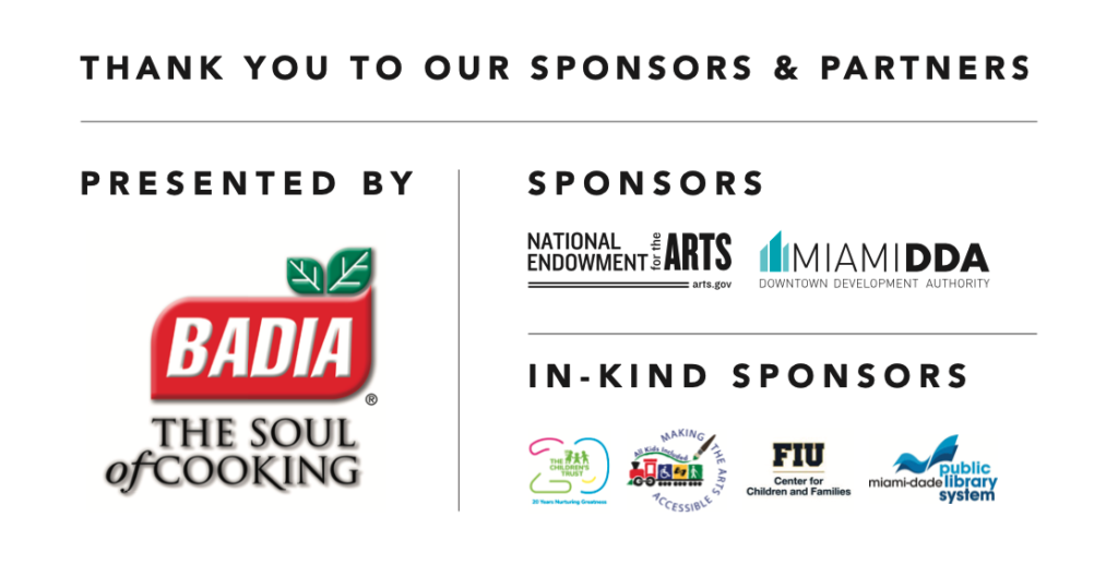Presented by Badia Spices, Inc. and supported by the Miami Downtown Development Authority and the National Endowment for the Arts, with in-kind support from All Kids Included, The Children’s Trust, FIU Center for Children and Families, Miami-Dade County Department of Cultural Affairs, and Miami-Dade Public Library System.