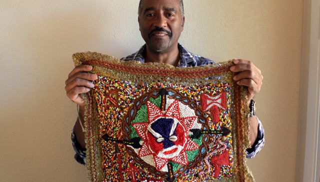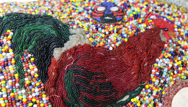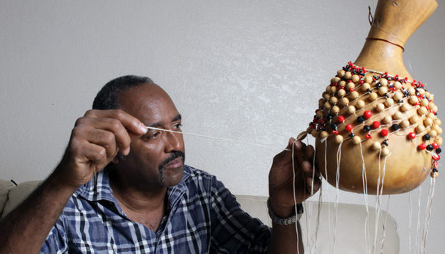 Torres also makes shekerés, different sized gourd rattles that are covered with nets of beads or seeds. These instruments are played in conjunction with a conga drum and a guataca (a hoe blade or cow bell) at ceremonies with less rigorous ritual requirements. Torres’s shekerés typically have colored beads which symbolize specific orishas, such as red and white for Shangó, and yellow for Oshun, the flirtatious river goddess.