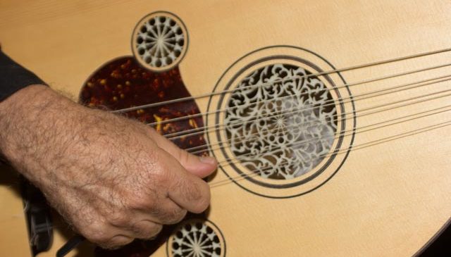 The oud is an eleven-stringed (double courses tuned in unison and a single bass string) lute without frets. It requires the same technique as members of the violin family. An unfretted instrument is necessary to play the microtones required of the music.