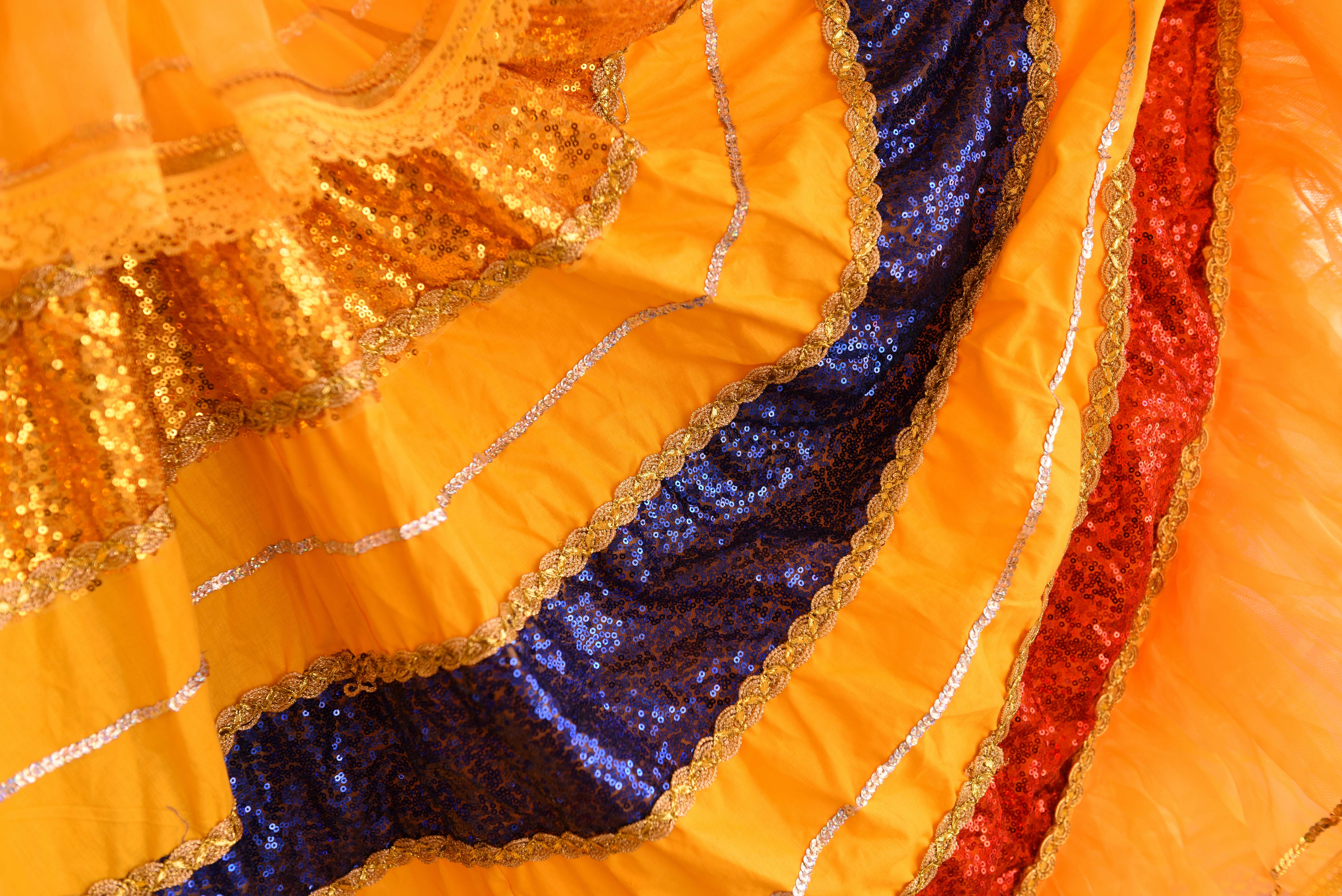Cumbia is danced by women dressed in long multi-layered skirts in different colors. Over the years, women’s Cumbia dresses became fashionable. Our first costumes were designed and created by Berty Rojano, my mother, who became a true artist designing beautiful dresses.