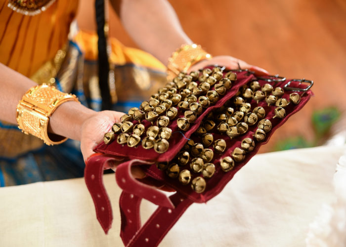 The Bharathanatyam costume is intended to look beautiful. It was the dress worn to dance for the gods in temples or for kings in palaces. Despite the resemblance to saris, Bharathanatyam costumes are not single pieces of cloth, but a combination of a number of specially stitched pieces. This customization makes them easier to wear, and easier to dance in than a sari. The costumes are bright and colorful and involve pleated pieces at the waist that fan out attractively during various movements. An essential item for a Bharathanatyam dancer is the pair of anklets or ankle bells (salangai in Tamil, ghungroo in Hindi). They make the rhythmic footwork of the dance audible. Dancers treat their salangai like musicians treat their instruments. The salangai are blessed by the dancer’s guru, they are worshipped on special occasions, and they are never worn casually.