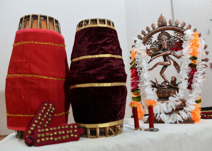 The dancer focuses on linking to the rhythm of the nattuvangam throughout the performance. Nattuvangam is a Tamil word that stems from the words natta (dancer or dance performance) and angam (body or main operating or controlling centre). The Mridangam is a percussion instrument from India of ancient origin. The instrument is most suited to classical Carnatic music which is sung for Bharathanatyam performance. The mridangist synchronizes to the dancer’s rhythmic movements and to the song.
