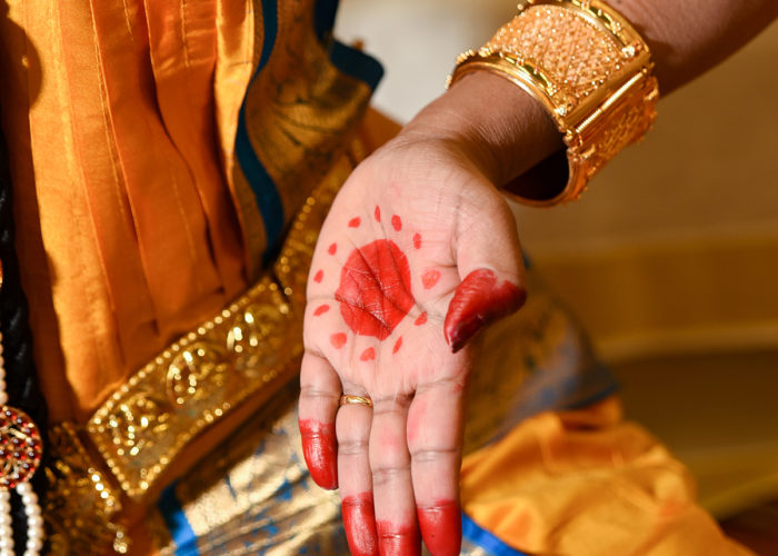 Women’s costumes involve a significant amount of jewelry, including bangles, rings, earrings, nose rings, and special ornaments for the arms and head. There is, of course, makeup for the dance, and Bharathanatyam makeup has few unique features. Heavy lines are drawn around the eyes, extending outwards past the eyes. Similarly, the eyebrows are darkened and extended outwards with liner. The purpose of this makeup is to accentuate the movements of the eyes and eyebrows and to make them more visible because they are an important part of the dance, especially for expression. A red dye is applied to the soles of the feet and the tips of the toes, as well as to the fingertips. It is also painted in a solid circle in the palm of each hand. This unique decoration serves to emphasize the movements of the hands and feet. Men’s costumes are simpler and usually consist of a type of garment called a dhoti which covers the lower body. Men also wear ankle bells or salangai. They wear much less jewelry than women but do apply the same makeup to the eyes, since it serves an important purpose in the dance.