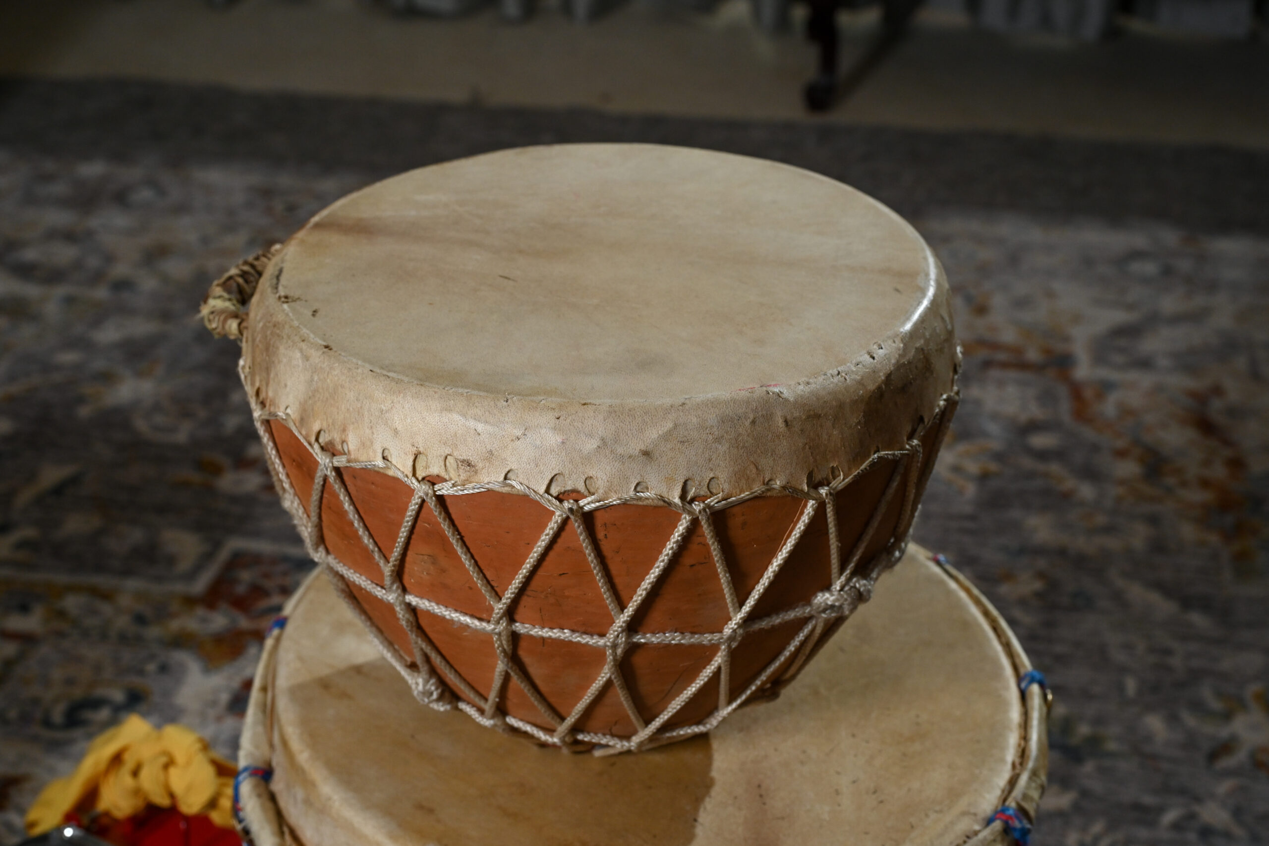 The traditional process of making a tassa uses clay shells. The shells are formed and molded from red clay and then are baked. They come in various sizes. The skins used for the drum heads are usually goat skins. The skins need to be shaved and cleaned, and they must be free of hair.