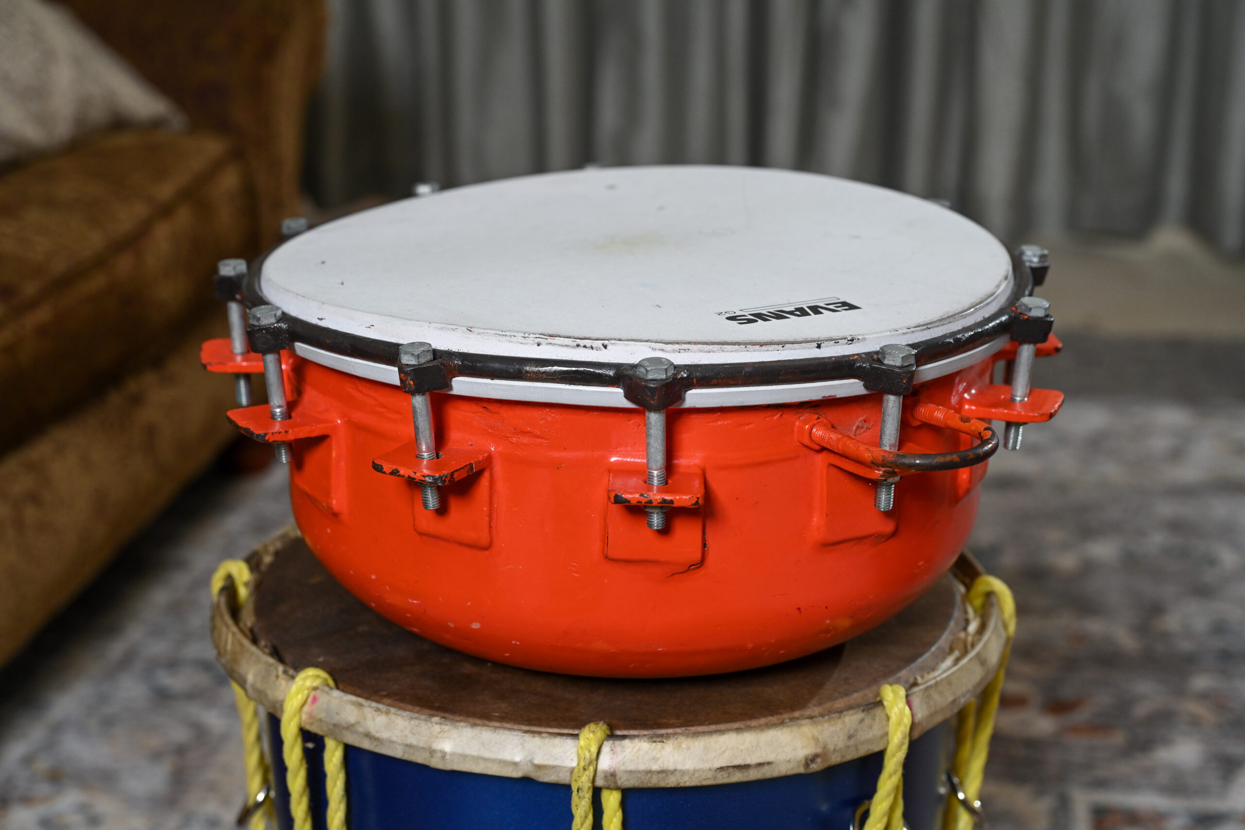 The modern drums used today are made from helium tanks which are cut and used for the drum base. Plastic drum heads are used to cover the drum. Brackets are welded to the drum to hold the drum heads in place. Once you put the drum heads together, you can tighten the screws to get the drum to the pitch or sound you desire. The difference is that with the original goat skin drums you need to heat the drums to get the desired pitch or sound.